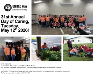The United Way of Daviess County is seeking business sponsors for its 31st Annual Day of Caring, set for Tuesday, May 12. Last year’s event brought together more than 600 volunteers from 57 businesses, schools, and organizations, completing projects for 20 local agencies and generating an estimated $93,000 in community impact through more than 2,700 volunteer hours. Sponsorships help cover event costs such as t-shirts, meals, and supplies. Businesses that contribute $500 or more by March 13 will have their names printed on the back of volunteer shirts and be recognized at the event, in the newspaper, and on social media. More information is available through United Way of Daviess County.